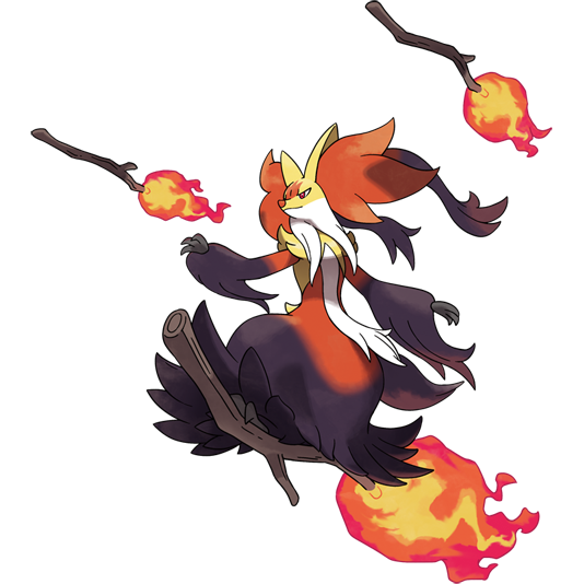 For instance, let's look Delphox. In the official artwork, it’s this really interesting, witchy Pokémon, with ear tufts that stick out in a way that feels like it’s meant to intimidate whatever it’s aiming its wand at, and that lean in that it’s doing really emphasizes a battle-ready attitude.