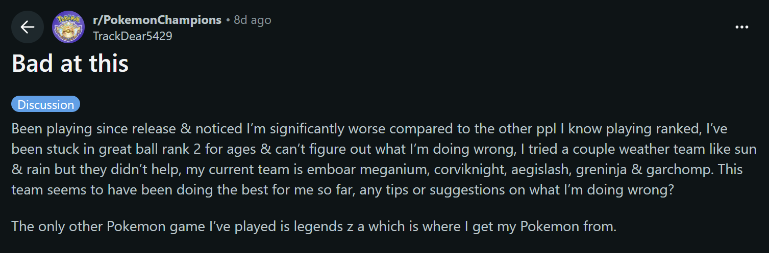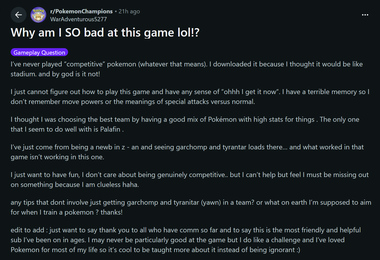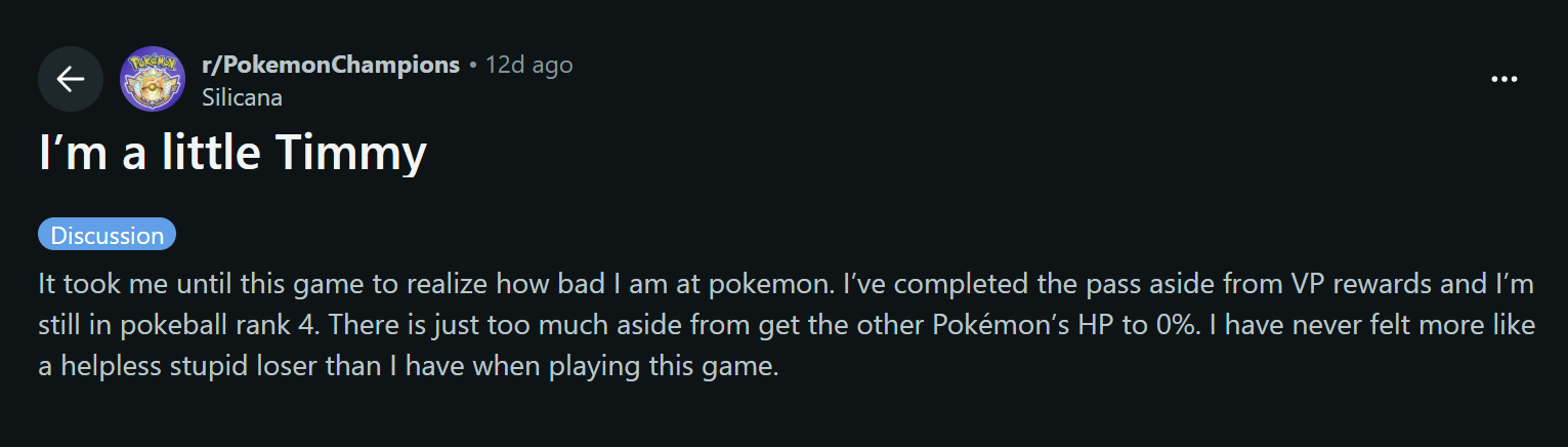 Champions is not a game built for the average Pokémon fan. Champions sits in a league of its own, designed to be an engine for official competitive play with a low barrier of entry. I believe that when White voices his criticisms, they aren’t coming from a perspective that’s in tune with this particular sect of the franchise and thus tackles them in a fairly inapplicable way.